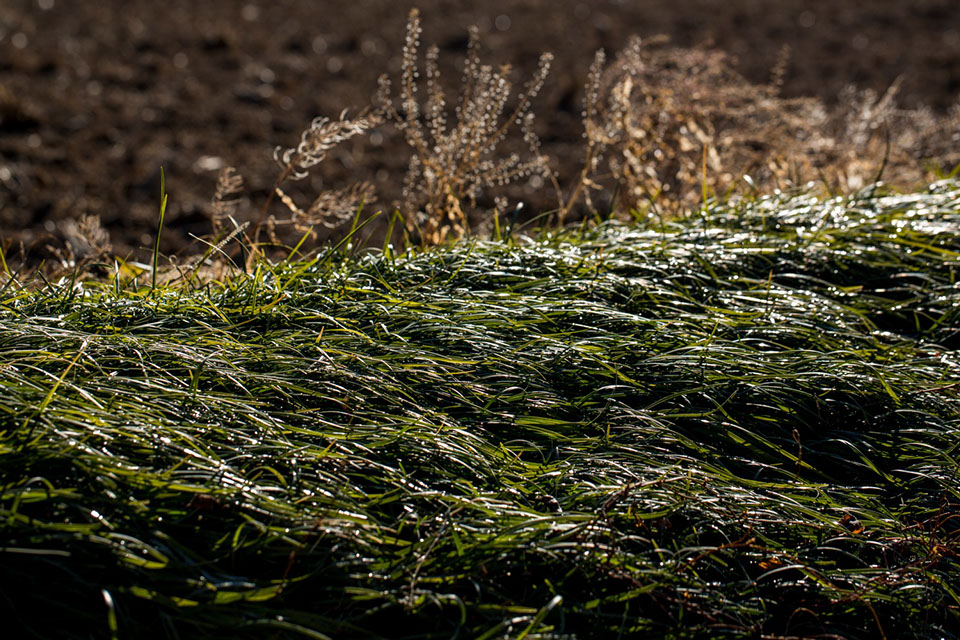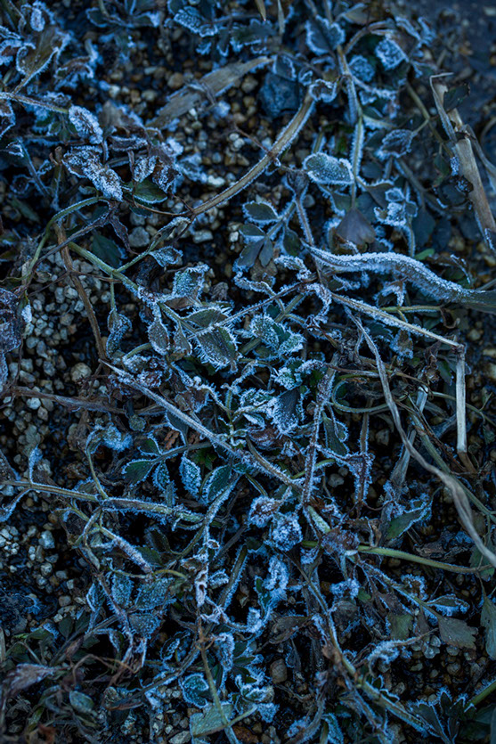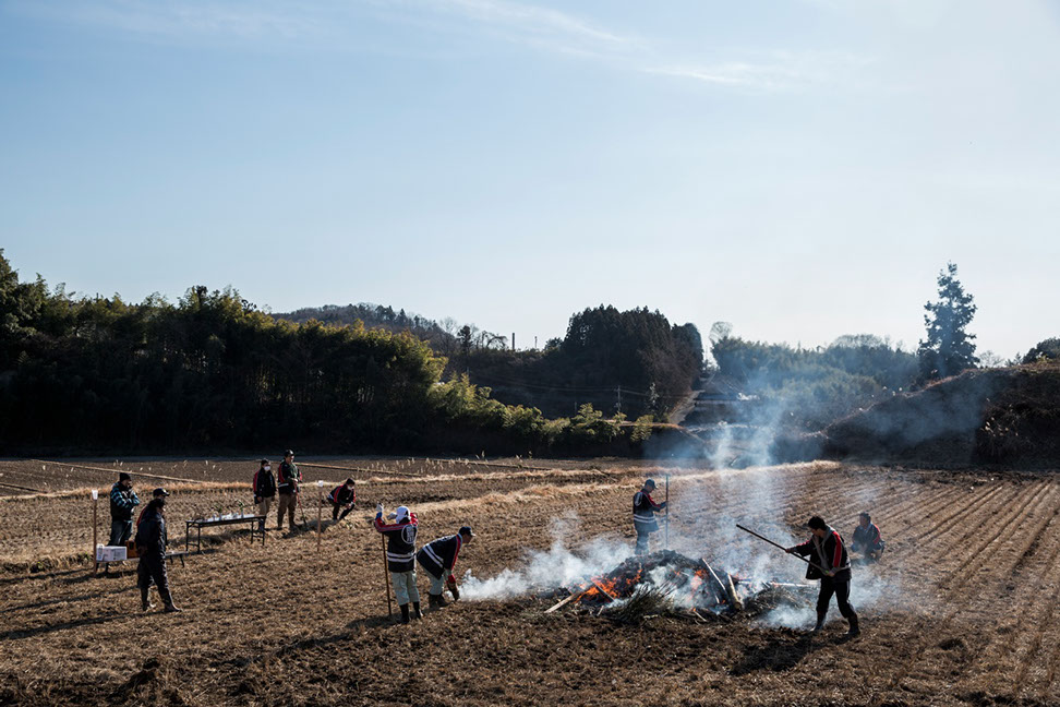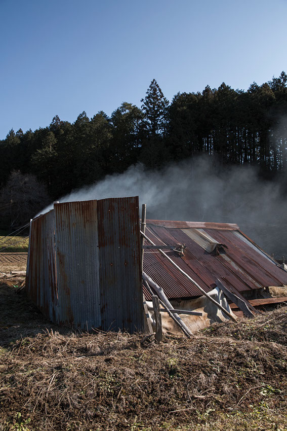 翌朝、示現神社の山から朝日が昇る前、恒秀さんの炭焼き窯を訪ねると、すでに窯から煙が上がっていた。元々は棚田だった周辺の土手の草や茶の葉が、霜でびっしりと覆われ白く輝いている。恒秀さんが窯口に座り込んで、炎に手をかざしながら薪をくべている。冷たい空気の中でパチパチと薪の爆ぜる音が、温かさを感じさせてくれる。
