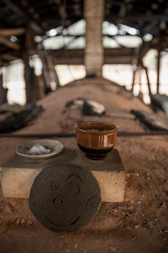 岡さんの焼き窯は、緩やかな斜面を利用して築いた穴窯だ。薪を10日間燃やし続け、窯内の温度を1280度まで上げて作品を焼く。