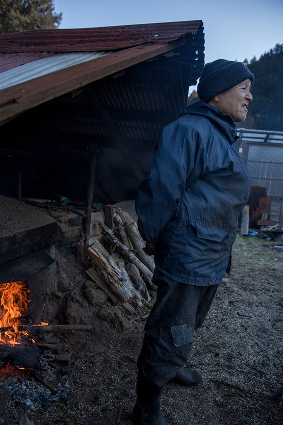「窯木を奥山から運び出してくるのが大変なんです。一か月ぐれえ前から伐って準備しとかないとね。ある程度乾燥しねえと燃え付かないんですよね。家の近くでやってるからできんですけど、山でやるんだったらとてもできないです。炭焼きの先生に教わって、ようやく3年目ですから」