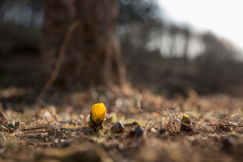 小砂地区で創作活動をする彫刻家の住まいの庭に咲いていた福寿草。小砂地区では里山の自然の魅力を活かした「小砂里山の芸術祭」が開催されている