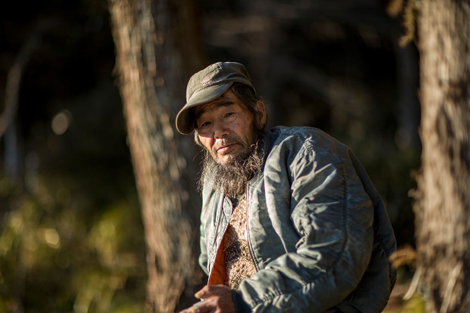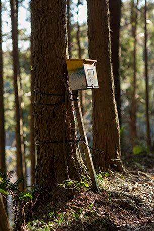 賢四郞さんと美恵子さんに別れを告げて、立野集落へ抜ける峠を越えようとすると、脇道へ逸れる山道の杉に縛り付けた郵便受けが目に入った。この上に、まだ民家があるのだろうか。山道の入り口に車を止め、杉林の谷沿いをしばらく歩くと、犬の激しく吠える声が聞こえてきた。やはり、民家があるようだ。恐る恐る進むと、民家の庭先で、大きな西洋犬が立ち上がるように私に吠え掛かってくる。鎖に繋がれていることを確かめて、山道をさらに登ると突然、開けた畑地に出た。畑の奥の方で、ひげ面の男が手作り風のベンチに座って、こちらをじっと見つめている。面倒なことにならなければ良いがと思いながらも、もう引き返すことはできない。思い切って、杉の木に縛り付けた郵便受けについて聞いてみた。