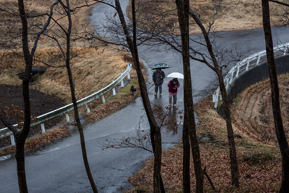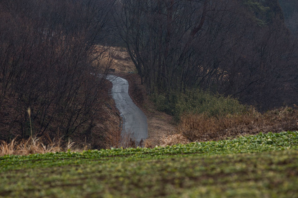 小砂地区を訪ねた1月中旬の一週間のうち、1日だけ冷たい雨が降り続く日があった。以前に、小砂地区の区長を務める笹沼亨一(ささぬま きょういち)さん(64)をお訪ねした時、小砂で一番美しい棚田のある地域として教えていただいた国山集落の棚田と雑木林を、傘を差して歩いた。棚田は、春の作業の下ごしらえとして冬耕が終わり、小雨に煙る静かな佇まいが、私の気持ちを落ち着かせてくれた。雨に濡れて光る道路を撮影しようとカメラを覗いていると、ファインダーの中に傘を差して、こちらに向って歩いてくる婦人の姿が見えた。彼女の歩いてきた方向には、民家の一軒も見えない。この冷たい雨の中を、どこから来て、どこへ行こうとしているのだろうか。だんだんこちらに近付いてくる彼女を待って、声を掛けた。
