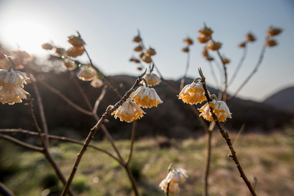 石部棚田の片隅に、誰が植えたか和紙の原料となるミツマタの木が4、5本。春を待ちかねたように咲いた黄金色の花が夕陽に輝く