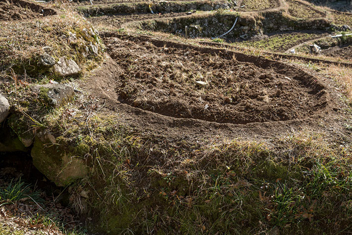 |「この石積みの棚田をね、先人が、これだけの石を集めて造ったとびっくりしてるんですよ。大変な労働だったと思うよ。棚田の1枚1枚全部に、真砂土(まさつち)といってね、下へ水が漏れない土の層が敷いてあるんですよ、全部。先人の知恵の素晴らしさっていうものがね。よーく、あれだけの先人の財産を残したかと感心するよ。それでね、20年掛かって、江戸時代に復元した当時は、みんな平等(へいとう)に、上から順に分けたんだってよ、始めは。だけんども、博打をやって、みんな取られちゃったんだってよ。俺、そういう風に聞いてるよ。うちの田んぼは、今は一番上だけど、まっと上にずっとありました。今は、杉林になってるけど」