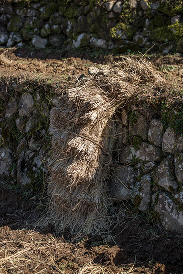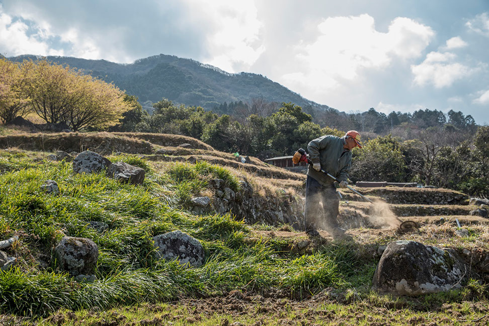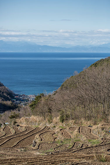 |大小の曲線が重なり合う石部(いしぶ)の棚田を縫うように続く石畳の道を上ると、両脇の田んぼは、早々と冬耕と畦切りが終わっていた。重なり合う棚田の下方に肩を寄せ合うように石部集落が小さく見え、その向こうに青々とした駿河湾が広がっている。石畳の道をさらに上り詰めると、棚田の畦にエンジン音を響かせて草刈りをする男性の姿があった。