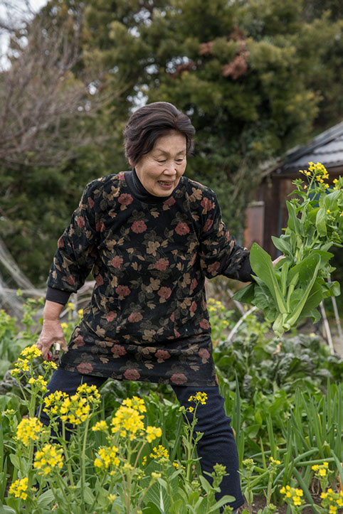 近所の庭先から菜の花をいただく髙橋公子さん(72)。
