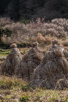 昨夏に刈り取ったカヤを積み上げたボッチ。代掻きが終わると田植え前の田んぼにボッチのカヤを敷き込み土を作る