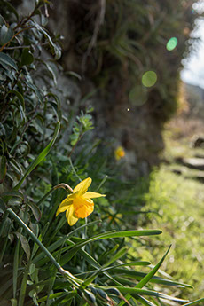 以前は棚田だったと思われる段々畑の片隅で、鮮やかな黄色のキクラミネウススイセンの花が咲く