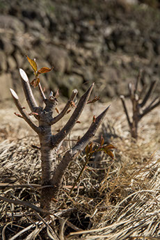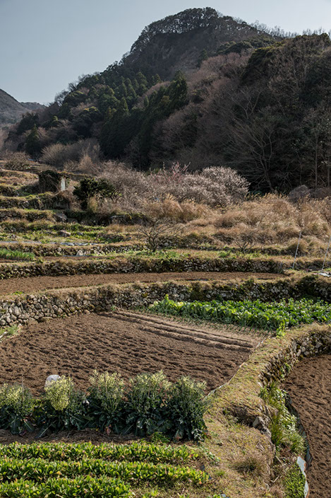 駿河湾から吹き上げてくる西風が強く、棚田に人影はない。石部集落の坂道を竹製の大きな背負い篭を背負って、大股でずんずん登って来る女性がいた。畑に大根を採りに行くのだと言う。同行を願って付いて行くと、段々畑にある畑は、頑丈な檻のように鉄パイプと網で囲われていた。猿が作物を荒らすため、全面的に囲って防御するしか方法がないようだ。どの畑も人間が檻の中で仕事をする状態になっている。髙橋 淑子(たかはし よしこ)さん(72)は、経営している民宿に畳職人が仕事に来ているからと、大根5本と菜花を少し収穫して、足早に帰って行った。