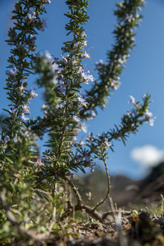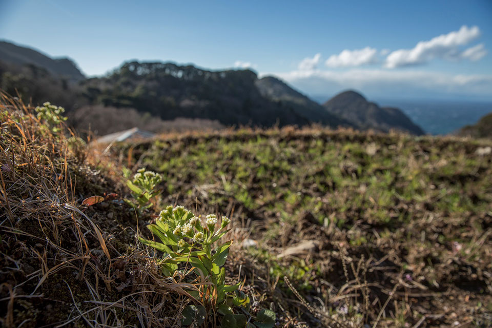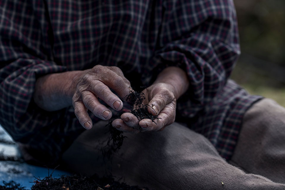 |集落の露地を歩くと、あちらこちらでヒジキを干しているのを見かけた。その中に庭に広げたブルーシートに背を丸めて座り込み、ヒジキからゴミを取り除いている姿があった。先日の強風で、ヒジキにゴミが混じり込んでしまったようだ。声を掛けようと、私が近付いても気付かないほど集中している。
