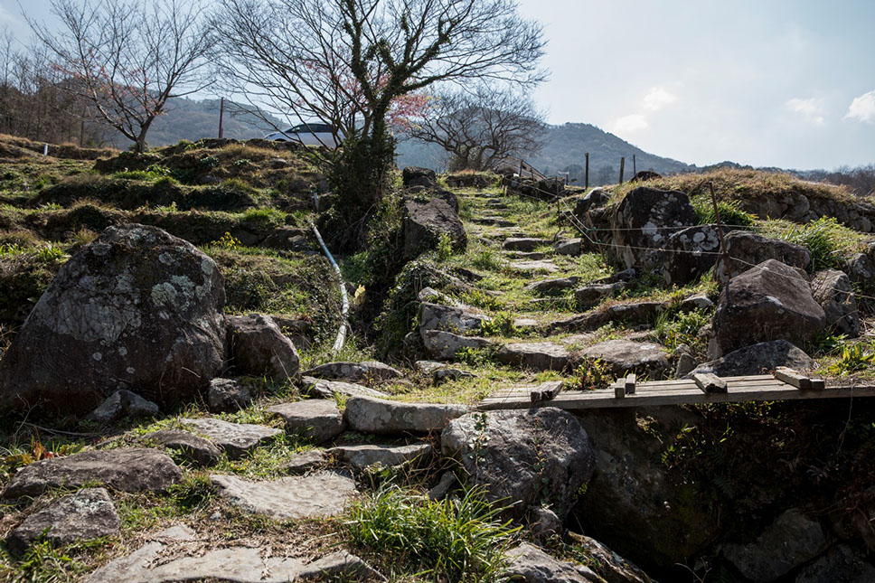 石部棚田を縫うように伸びる石畳の道。農水省の補助事業で農道が通るまでは、標高差が100m余あるこの道を歩いて登り耕作していた