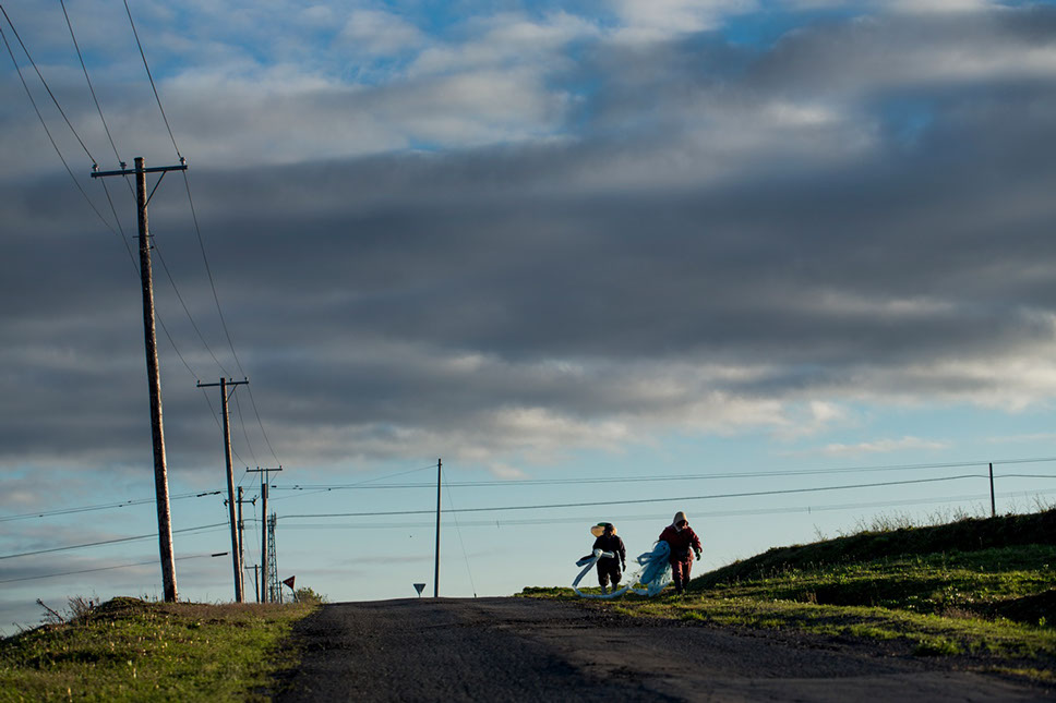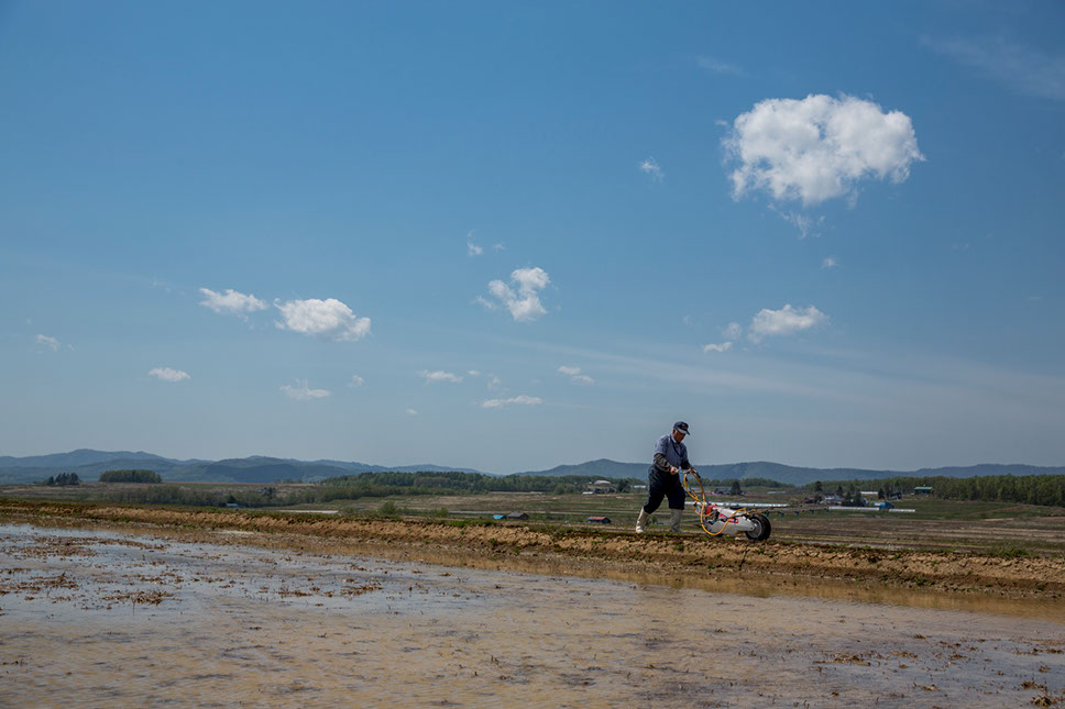 |東鷹栖北地区を離れる日の夕方、久し振りに日射しが射し込んで棚田の風景が輝いた。棚田の畦を歩く2人の美しいシルエットが見えた。影絵の一場面を見ているようだ。男性は背中に顆粒状の除草剤を入れるタンクを背負っていた。相馬国男(そうま くにお)さん(71)と礼子さん(70)が、田植え前の水田に稲以外の雑草を生やさないために除草剤を撒いていた。もちろん、相馬さん夫妻は、水稲農家としてこの時季に当然しなければならない農作業をしているだけなのだ。