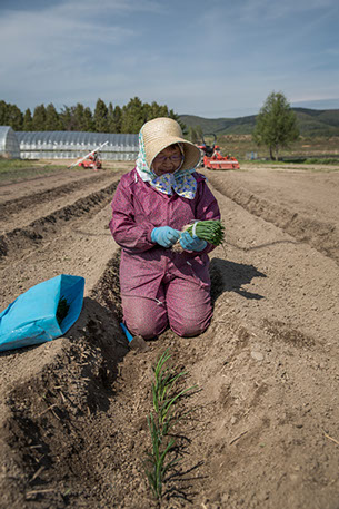 |栄一さんは、畦に吹き付ける風が強く除草剤が飛び散ってしまうため、作業を途中で止めて、田んぼ近くの以前住んでいたという家に帰ると、横の畑で妻のハル子さん(74)がネギの植え付けをしていた。深く帽子を被りカッパを着て、ネギ苗を2本ずつ15センチほどの間隔で植えていく。栄一さんは家から水道ホースを引っ張ってきて、横の畝に植えてあるタマネギに水をかけ始めた。