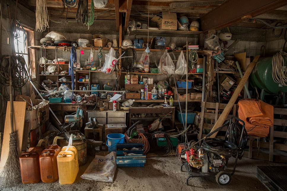 栄一さんの農機具倉庫の壁には機械や工具、油類が整然と置かれ、何があっても自分の手で対処してきた歴史が見える