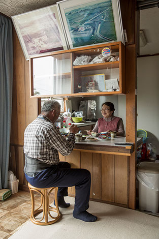 |翌日も栄一さんは除草剤を撒いていた。この日はハル子さんも一緒だ。トラックに積んだ黄色いタンクの除草剤を、手押し車式の動力噴霧器に移し替えて斜面の広い畦に撒いていく。私は、もう少しゆっくり話を聞かせてほしいからとお願いして、昼食の時間に田んぼ近くの以前の家へ押しかけた。