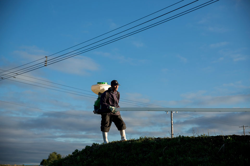 |「農家は面白いですよ。言葉は通じないけど(作物と)話しはできる。(米の)食味は平均より上で、収量もそれなりに穫れる線を狙ってやってるけどね。肥料過多にしたらタンパク質が高くなって味落ちるから。だいたい夜8時ぐらいに眠って、朝3時に起きてあんま機掛けて4時前には田んぼに来てます。7時半ごろ朝の弁当持って来てもらうんです。今の時期だけですね。除草剤は、今撒いて押さえておきゃ、残ったとこだけ刈れば良いから。葉っぱだけ枯らして根っこは枯らさない。その濃度を自分で決めるんです。昔の農薬、パラチオン剤は何にでも効いたけど、今は、散布する時期が限られているし、人に優しく虫にも優しい。除草剤使わなかったら、他の作業が間に合わなくなるから。10日間はびっちり掛かるもん」