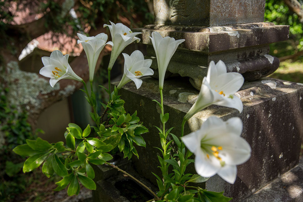 テッポウユリを供えた鈴木利雄さん宅の墓地