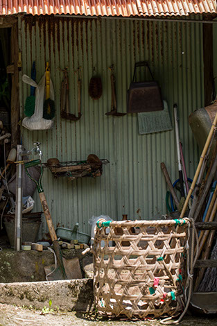 石井伉次さん宅の納屋の壁に整理して吊された道具類に