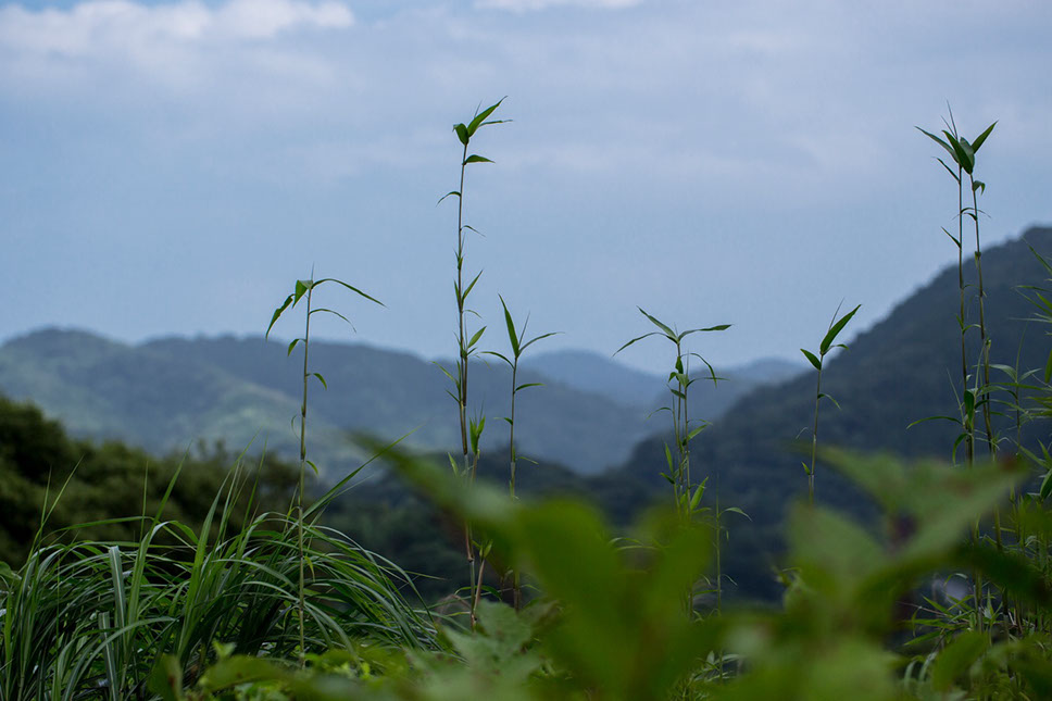 鈴木雅夫さん宅から裏山へ抜けると、穏やかな稜線の低い山の重なりが見えた