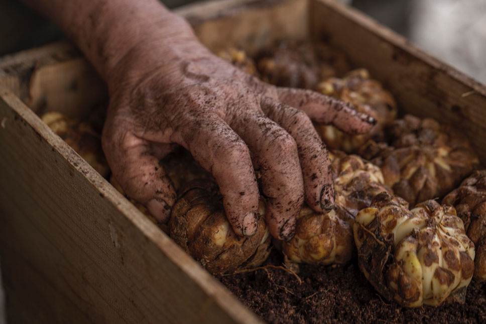 沖永良部島から取り寄せたテッポウユリの球根を箱詰めする鈴木通夫さんの手