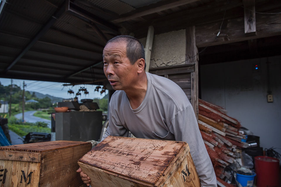 |テッポウユリの球根が入った木箱を、納屋を改造した冷蔵庫に運んでいた利雄さんは、仕事を終えて一足先に自宅に帰っていった。夕暮れ迫る作業小屋で、木箱に腰を下ろしたままの通夫さんがひとり、遠くを見つめ、穏やかな表情で座り続けている。