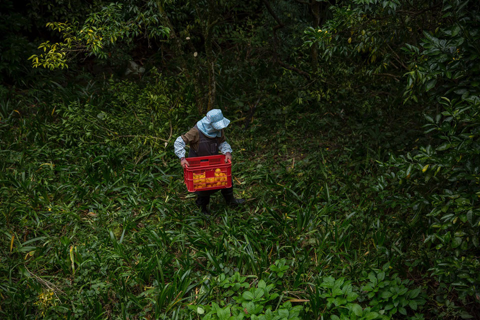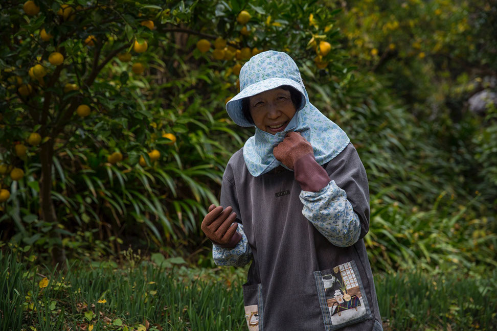 柚子の収穫をしていた瑩子さん。背景の黄色い実は「ゆこう」と呼ばれる柚子の変種で香気が強い