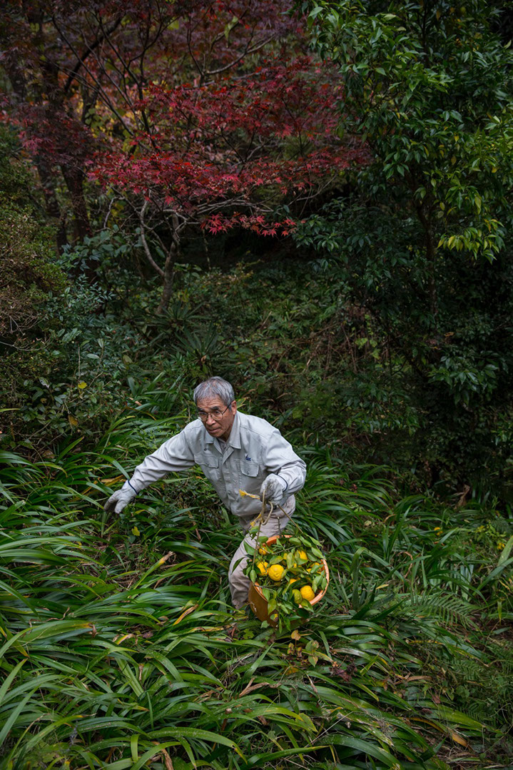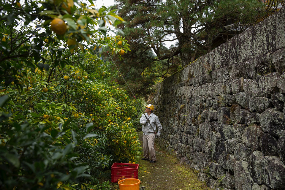 |茂樹さんと別れた後、森本友章(もりもと ともあき)さん(77)が収穫をしている自宅下の柚子畑を訪ねた。友章さんの自宅は、国の登録有形文化財に登録されている江戸と明治時代に建てられた立派な建築物だ。石垣下の柚子の木は、上へ伸びて高枝バサミでないと実を採ることはできない。柚子の木は鋭いトゲがあるため木に登ることもできないのだ。友章さんは、大きな枝をチェンソーで切り落としてから収穫している。