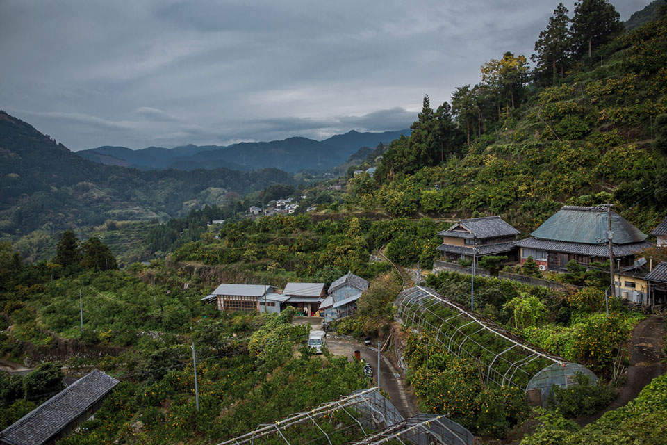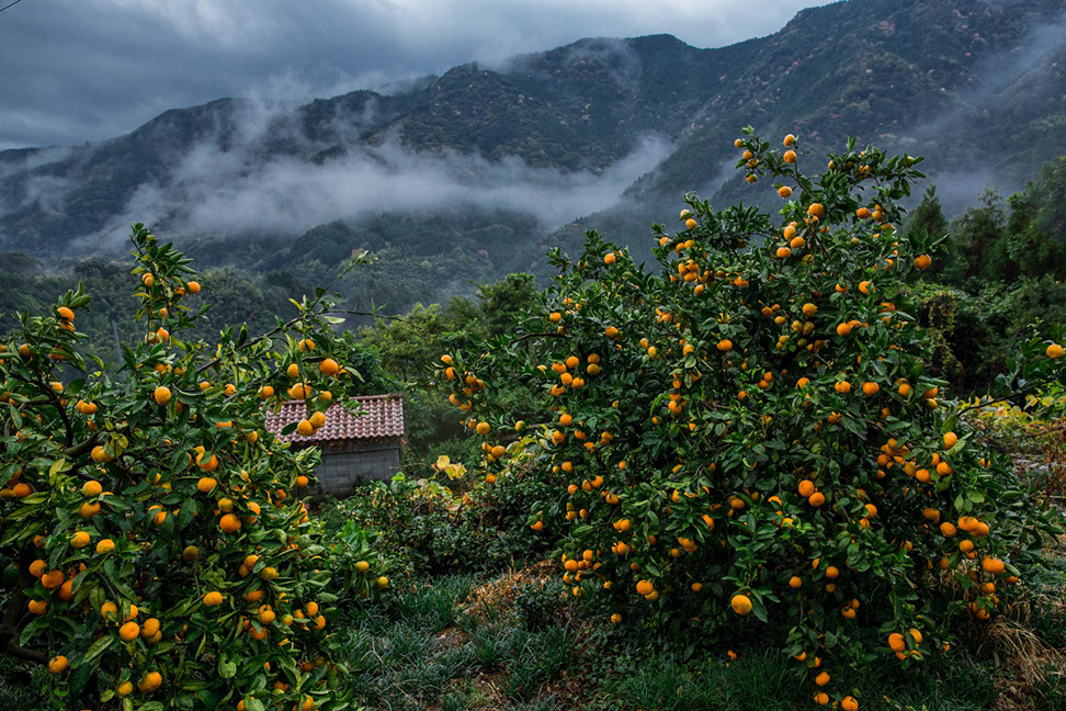 小雨の降る朝、安宏さんがすだちの選果をしている作業所を抜け出して坂本地区中谷を歩くと収穫前の晩生みかんの畑が谷の下へ続いていた