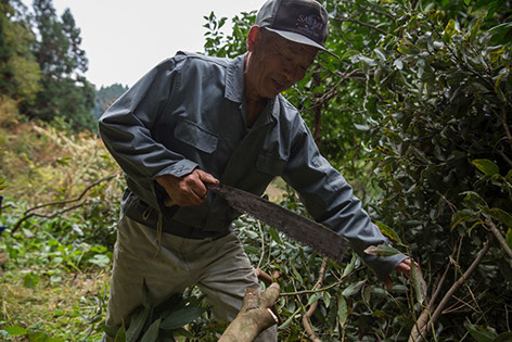 茂樹さんが旧自宅の裏山でニッキの木を切り倒す
