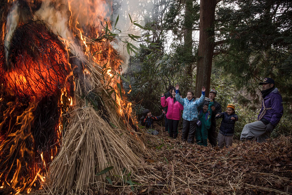 |「焼け八幡」の竹運びは、小学生の役目で1年生からやりますけど、ワラを運ぶのは女の人は駄目っていうか、男の人の仕事なんです。だから、今年が最後の竹運びでした。中学生になったら、もう女の子は「焼け八幡」に参加することは無くなります。竹運びはすごく辛くて、ああ、やっと終わったという気持ちもあるけど、何か、ちょっと寂しい。御小屋を燃やす時には見に行くけど、後は全然関わりないっていうか、そんな感じ。1年生の時と今年、朝早く起きて、御小屋を焼くのをお母さんとお姉ちゃんと一緒に見に行きました。