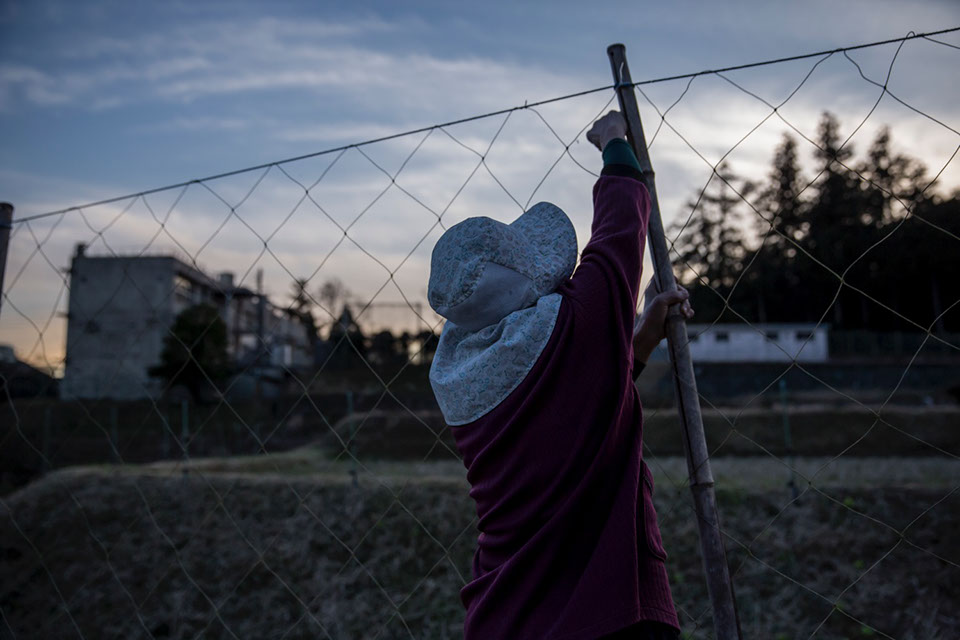 馬郡さんは自然界の悠久の時間と向き合い思考している。農業を考えることは、地球の時間を考えることのようだ。苗床を作るためのビニールハウスを持たない馬郡さんは、朝夕冷え込むこの時期、まだ夏野菜の準備をすることができない。実エンドウの蔓を絡めさせる棒を1本1本布で拭き続けているうちに、とっぷりと日が暮れてきた。