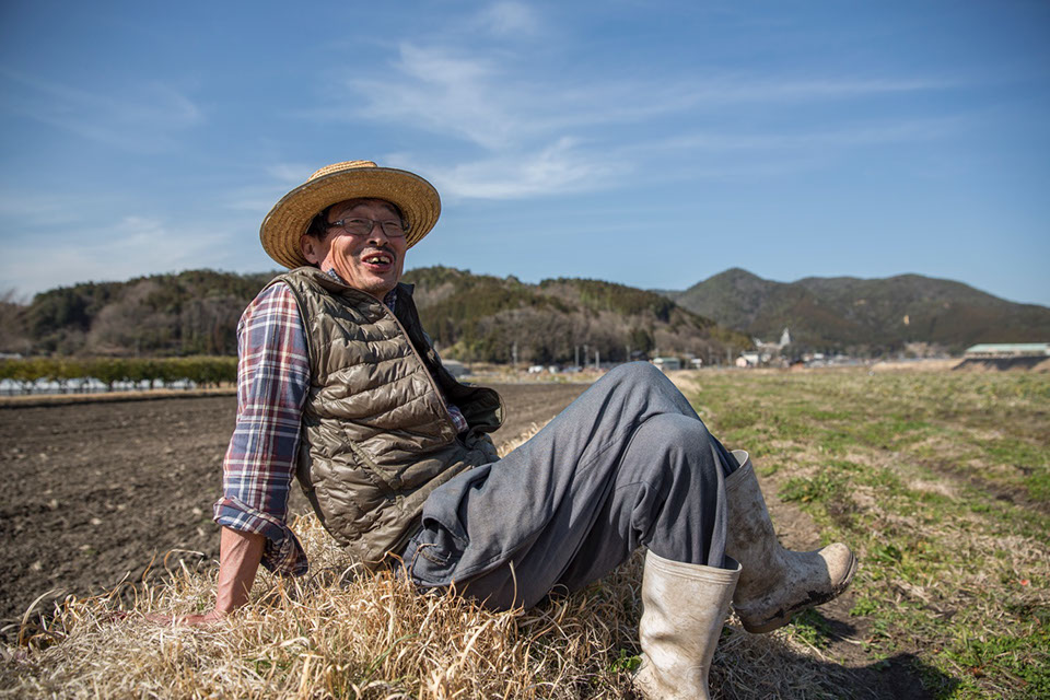 農業研修生を受け入れている原田富生さんは、作業の手を休めて畦に腰を下ろし、ゆっくりと話をする