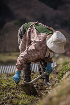 |腰をくの字に曲げて草を取っている秋子さんは、時折、鍬の柄を支えに腰を伸ばし、遠くを走る車をじっと眺めている。