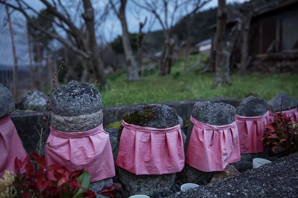 東藤木集落の川勝一弘さんの栗畑の一角に祀ってある6体の地蔵さん。「年寄りの人が年に1回、前掛けを替えてくれますのや」