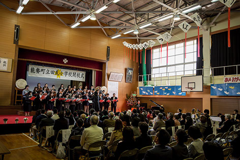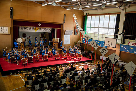 田尻小学校閉校式の第二部オープニングで、田尻小の児童たちが何度も練習してきた