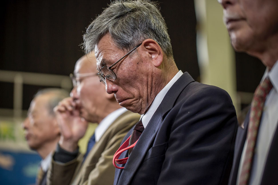田尻小学校閉校式に歴代同窓会会長として出席した小林繁さんが、最期の校歌斉唱の時に顔を歪め涙を堪える