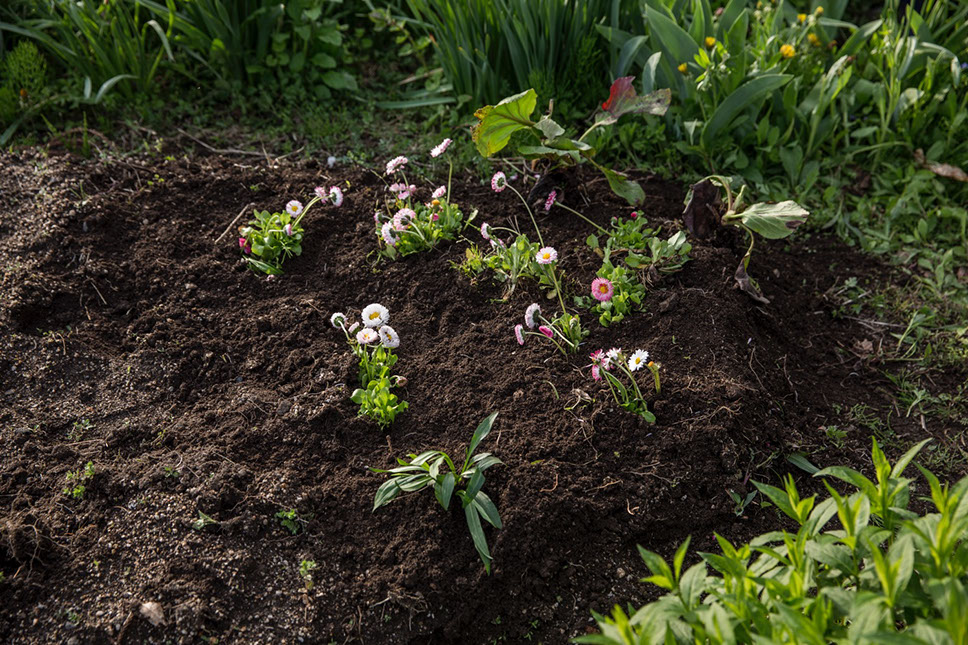 近所の友だちから貰った花の苗を家の前の小さな畑の隅に植えた