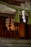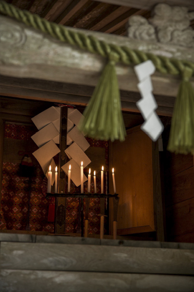 一同の笑い声が収まったところで、「ほんなら、そろそろ5時になるさかい。ロウソクの方、お願いいたします」と、総代長の小谷さんが声を掛け、祭壇のロウソクに火が灯された。区長の稔さんと一緒に参拝にやって来た前田孝晴(まえだ たかはる)さん(57)は、同じ吉ヶ池集落の氏子だが、神社の役付ではないので唯一のお客さんだ。拝殿の皆が、神妙に姿勢を正すと、亀山宮司の叩く太鼓の音が、ダンダンダンダン、ダダダダ、ダーンダーンと集落まで届くように鳴り響き、宵宮の始まりを告げた。