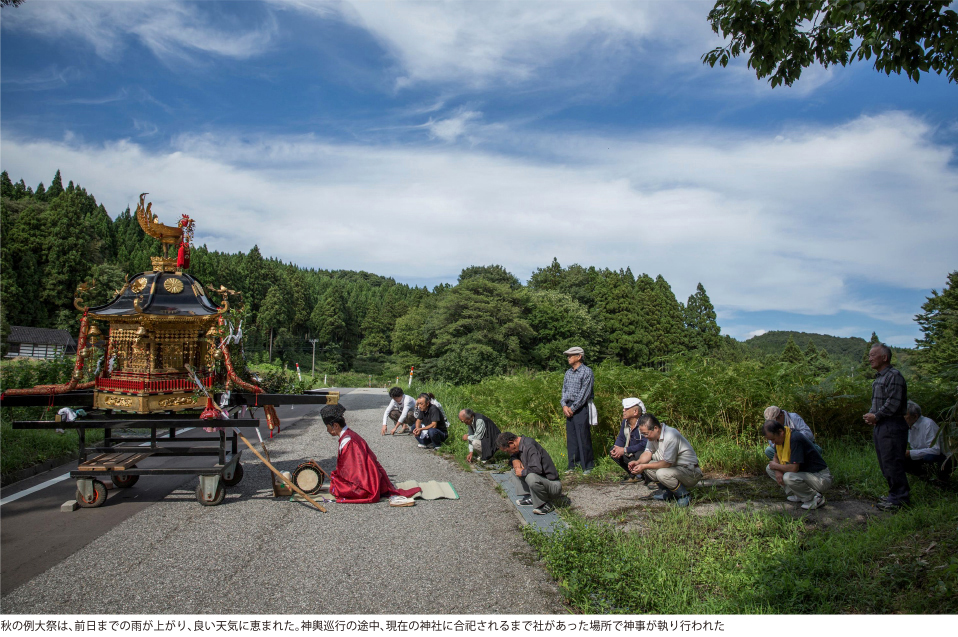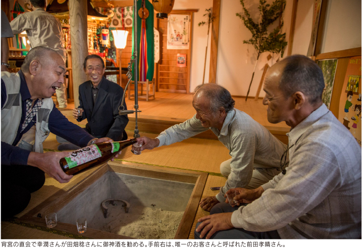 参列者全員が玉串を供えて神事が終わった。祭壇にお供えしてあった御神酒が下ろされ、直会が始まる。参列している全員が、幼い頃からの顔見知りだ。一升瓶から小さなガラスの猪口に御神酒を酌み交わしながら、屈託のない四方山の話が続く。この夏は、ミョウガが異常な高値だったことが話題になった後、酒を飲まない区長の稔さんが神妙な顔で話し始めた。