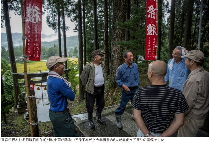 「このままいったらぁ(住んでる人が居なくなって)地図から抹消されるとこに住んどるんやから、どんな生活をしとるかを伝えんといかんと思うて、棚田作ってぇ若い人に教えとるんや。去年の秋にぃ、耳にチンチロリンを下げた若い娘が5人も来て、おいちゃんどうやって稲刈るのと聞くのでぇ、こうやって稲を握ってぇ、と教えてやってるとぉ、ええ香りがしてくるんや」。「それじゃエロ親父やないか」。幸潤さんが茶化すと、稔さんが苦笑いし、一同は大笑いだ。まだ空が明るい内に、直会はお開きになり宵宮は終わった。明日は、いよいよ秋の例大祭である。