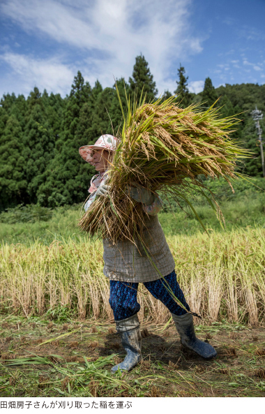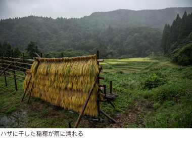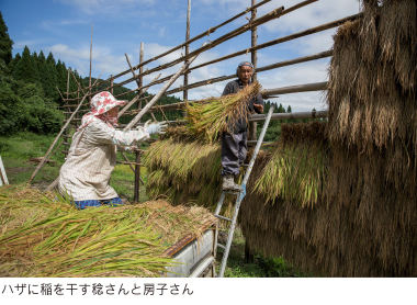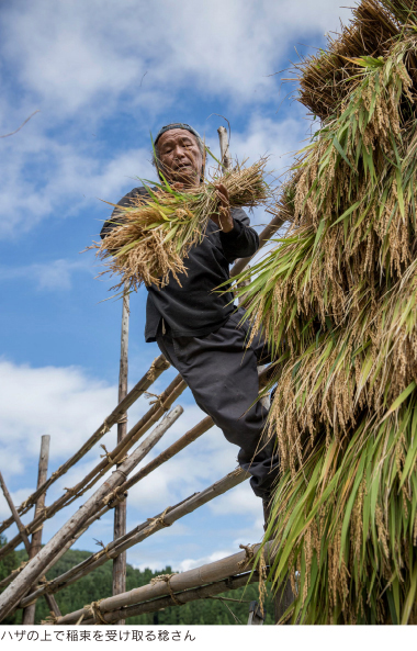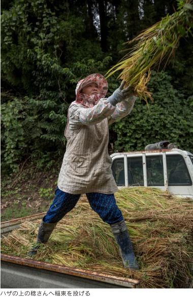 稔さんは、刈り取った稲をハザ干し(ハザに掛けて天日に干す)するために、稲刈りと脱穀を同時に行う自脱型コンバインを使わないで、1条ずつ歩いて刈り取っていく。手間の掛かる作業だ。房子さんが、刈り取って束になった稲を集めて1tトラックに積み込むと、ハザ干しをするために集落下の棚田に向かった。10段もある大きなハザだ。房子さんがトラックの上から稲束を一束ずつ投げ上げると、ハザの上で待ち構えている稔さんが受け取る。稔さんはすばやく稲束を半分に分けて開き、手際よくハザに掛けていく。息の合った夫婦の仕事だ。