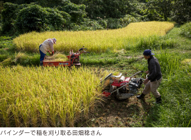 吉ヶ池集落の区長を務める田畑稔(たばた みのる)さん(65)と妻の房子(ふさこ)さん(62)が、バインダー(小型稲刈り機)で棚田の稲刈りをしているのに出会った。