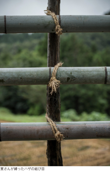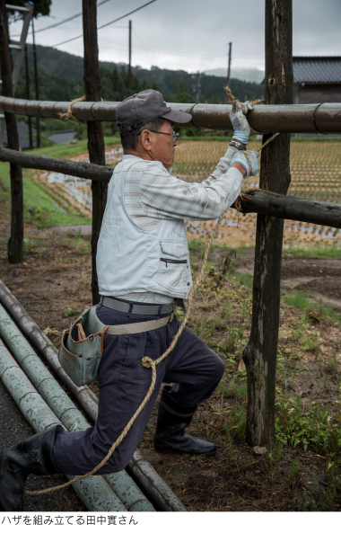 吉ヶ池集落を歩くと、いくつものハザが作ってある。それだけハザ干しにこだわる農家が多いということなのだろう。小雨の中、田中實(たなか みのる)さん(74)がひとりでハザを組み立てていた。脚立を使って孟宗竹の片方を持ち上げ、そこを縄で縛って、もう片方を持ち上げて縛っていく。支柱に縛り付ける際に、下の段と上の段、左の支柱と右の支柱が交互の方向になるように縛っていく。そうすることによって、稲を干して風が当たる時の揺れに強くなるのだそうだ。孟宗竹を縛り終えたら、支柱を前後左右から支えるために杭を打ち込み番線で括り付ける。ハザはもうビクとも動かない。「倒れてからでは遅いですから」。實さんの言葉に、稲を干した時の風圧の強さを知った。