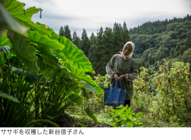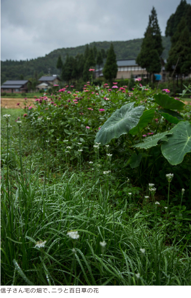 實さんの作ったハザの下を、白い頭巾を被った新谷信子(しんたに のぶこ)さん(74)が降りて行った。下の畑でササギを採るのだと言う。雨はもう上がっていた。6月ごろに種を蒔いて支柱を立て、蔓を土に付けないように育てたササギだ。「天気が良ければ、収穫は中2日ほどおいて、今日が4回目」だと言う。様々な野菜が少しずつ植えてある。ニラがあちこちで花を付けている。「種が飛んで、ガツガツ増えて」。トマトは、真っ赤に熟れたまま枯れかかった茎に放置されている。「トマトは、腹いっぺ取ったし」。家の前の畑では、コイモ(里芋)にクリーム色の花が咲いていた。「私、嫁に来て(この花を見るのは)初めて。もう、はや、50年近くになるよ」。身近な自然の変化を楽しんで暮らす信子さんは、乙女心を失っていないのだろう。