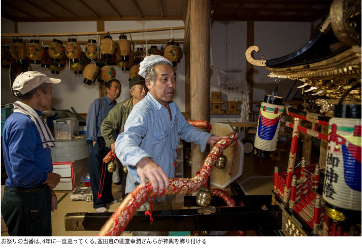 氏子総代は、行政区画で分けられた4つの班から1人ずつ3年任期で務め、当番は、集落で古くから続く家の位置によって分けられた釜田班、圓堂班、東班、田中班の4班が、毎年順繰りに務める。今年は釜田班が当番の年だが、この一年間に集落で5人が亡くなり喪に服しているため、秋祭りの準備は例年より変則的になっている。