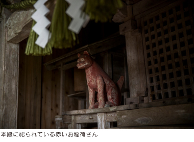 「神輿動かさにゃ、お供えもんでけんやないか」「皆、力貸して」「けんちゃんの活躍には、ちょっと負けるけど」「毛の数では俺が負ける」。頭髪を剃っている健一さんと幸潤さんの言葉のバトルが、またまた始まった。区長の稔さんが、ここで一気に回覧板を渡してしまおうと、4班分を一緒に持って上がってきたので、拝殿は急に賑やかになった。準備がひと区切り付いた時だった。誰かが亀山國彦(かめやま くにひこ)宮司(54)へ、氏神様に稲荷さんが祀ってあるのは不思議だと、質問をした。確かに、本殿内には、ご神体を護るように左右に阿吽(あうん)の相をした赤い稲荷様が祀られているのだ。