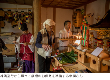 宵宮が始まる頃には、雲の切れ目から青空も覗き始めていた。午後4時に再び拝殿に集合した総代と当番の6人は、参道入り口の大幟を揚げ終わると拝殿の祭壇を準備に掛かった。
