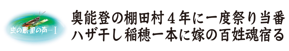 「ここの田んぼは水の便が悪いからぁ、草が生えてしもぅてぇ、稲の成長が悪いんや。能登ひかりという品種なんやけどぉ、稲が短くてぇ、家の前のハザには掛けられんのやわぁ。こんなん掛けとったら、みんなの話のネタになってしまうわぁ」