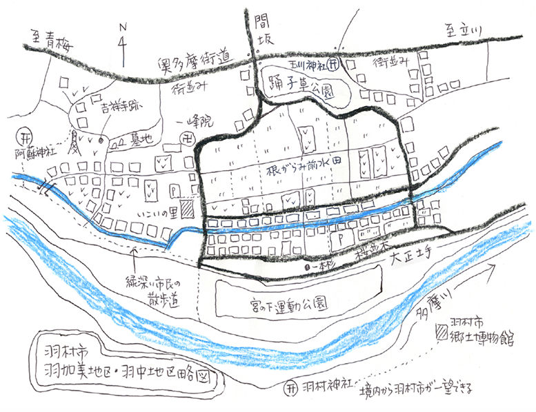 根搦み前水田には、農地を維持するために耕作している家庭菜園的な畑もいくつか見かける。羽村市内ではあるが青梅市に近い小作地区から自転車で畑に来ていた森美穂子さん(79)は、親の遺産として引き継いだ畑を兄姉3人で作っている。「遊びみたいなもんですよ」と言うが、ジャガイモ、ナス、小松菜、ニンニク、タマネギ、スナップエンドウ、ラッキョウ、レタス、トマト、キュウリ、三度豆、ピーマン、ササゲ、ヤツガシラなど、少量ずつだが多品種の栽培だ。「姉はね、隣の畑でスイカやるんですよ」と、ちょっとうらやましそうだ。スイカを植える予定だと指さす畑を見ると、既に石灰が撒かれ準備万端のようだ。「私はね、ゴマ。これを今年は挑戦してみたの。(芽が)出るか出ないか分からないけど。固いよ、雨降らないから」と、風呂場で使うような小さなイスに座って、移植ごてで土寄せをしていた。