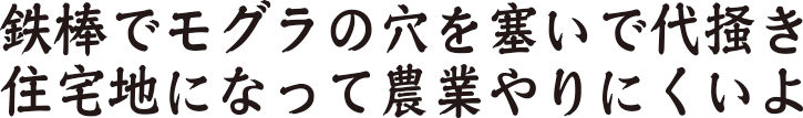 「モグラが居るんだ。モグラが居るってことは、ミミズが居るってことだからな。土地が肥えてることで良いことなんだけど、モグラが穴を開けるから、水が溜まらないっていうのが困るんだ。まったくな、毎年、一年生なんだ。去年良かったって思ってもダメだよ。鉄棒で突いて、モグラの穴を塞ぐんだ。自然には勝てねえよ」
